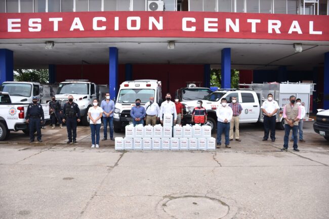 En la ceremonia de entrega, el Presidente Municipal estuvo acompañado por el Titular de la Unidad de Protección Civil, David Esponda Cruz y el Secretario del Ayuntamiento, Miguel Guillermo Pintos Guillen, así como elementos de la Policía Municipal y Tránsito del Estado.