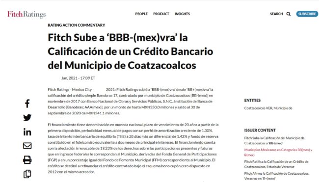 Específicamente la calificadora Fitch, le otorgó en sus ratings una calificación de BBB, la cual, considerando la escala conocida y manejada por las empresas calificadoras, ha permitido al crédito municipal colocarse dentro de un grupo aceptable, para la consideración de inversionistas más serios y formales, abriendo camino a oportunidades de progreso que no eran alcanzables hace más de 3 años.