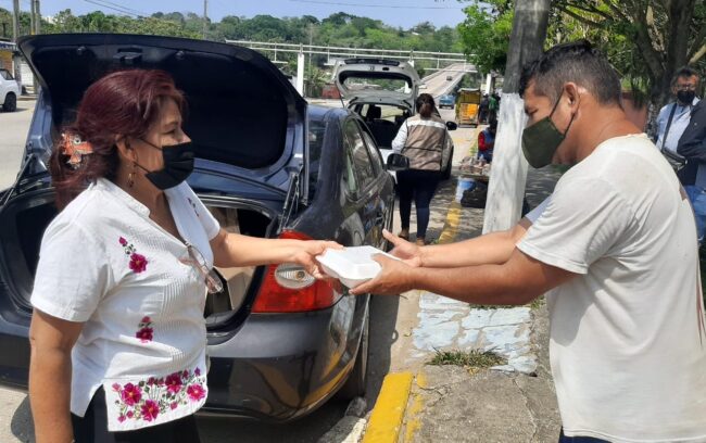 Hoy, nuevamente se privilegió el orden en la entrega y los que acudieron sin cubrebocas recibieron uno desechable, se les aplicó gel antibacterial y al término de ingerir sus alimentos, se les invitó a que depositaran su basura en los contenedores colocados cerca del módulo.