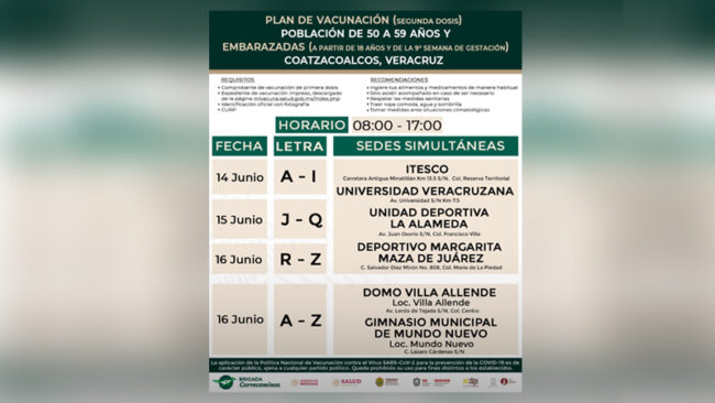 Coatzacoalcos, Ver. – Del 14 al 16 de junio, se aplicará en Coatzacoalcos la segunda dosis contra COVID-19, a adultos de 50 a 59 años cumplidos y mujeres embarazadas mayores de 18 años, así lo informó el Gobernador Cuitláhuac García.