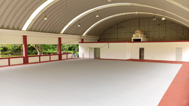 En este espacio, se puso recubrimiento deportivo antiderrapante, se hizo la preparación de la superficie y reparación de juntas; posteriormente, sellador para dejar el suelo totalmente plano y nivelado.
