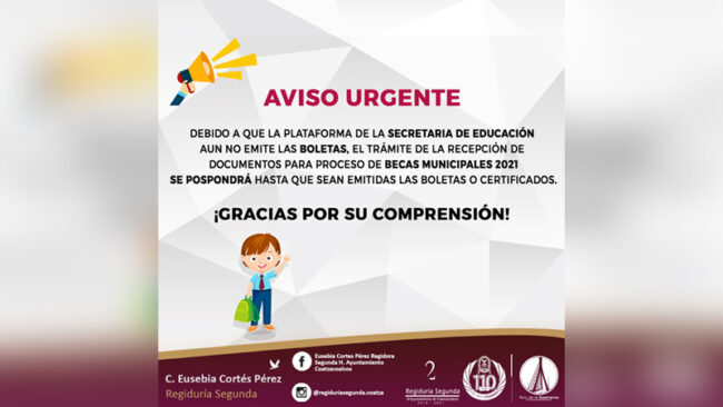 La Regidora Segunda, Eusebia Cortés Pérez, explicó que sería del 12 al 16 de julio cuando se llevaría a cabo el registro para las becas, pero dado a que la SEV no ha entregado boletas, este trámite se pospondrá hasta nuevo aviso.