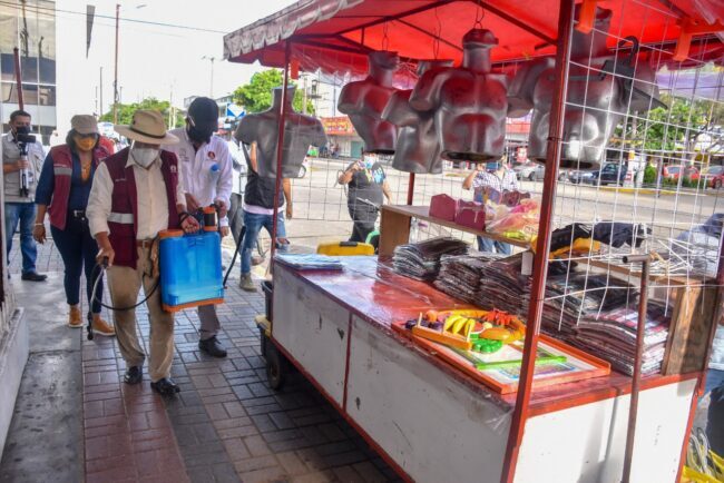 En un esfuerzo conjunto entre personal de Protección Civil y la Dirección de Comercio, se le está brindando atención en materia de higiene a los puestos de alrededor de 100 comerciantes informales que se asientan en los principales cuadros.