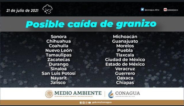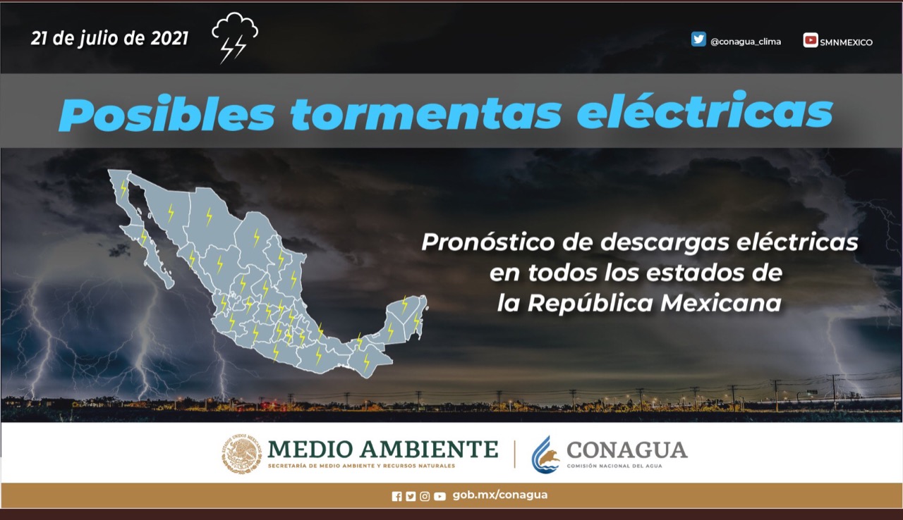 En la mayoría de las entidades, las precipitaciones podrían acompañarse de descargas eléctricas, y se estiman condiciones para la caída de granizo en Chiapas, Chihuahua, Ciudad de México, Coahuila, Durango, Estado de México, Guanajuato, Guerrero, Jalisco, Michoacán, Morelos, Nayarit, Nuevo León, Oaxaca, Puebla, San Luis Potosí, Sinaloa, Sonora, Tamaulipas, Tlaxcala, Veracruz y Zacatecas.