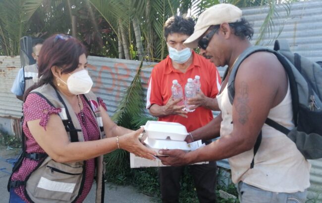 En punto de las 13:00 horas de este día, el módulo de distribución se instaló en las Náhuatl y Campesinos, en donde personal de la Dirección de Programas Sociales, encabezados por su Titular, Sandra Collins Coronel, repartieron 180 viandas que contenían mole con pollo, arroz, además de tortillas y una bebida, siendo jugo para los niños.