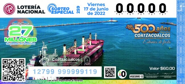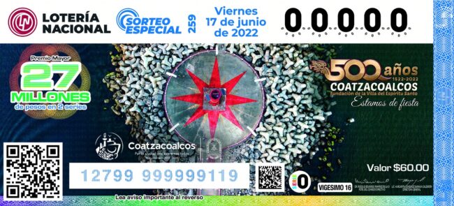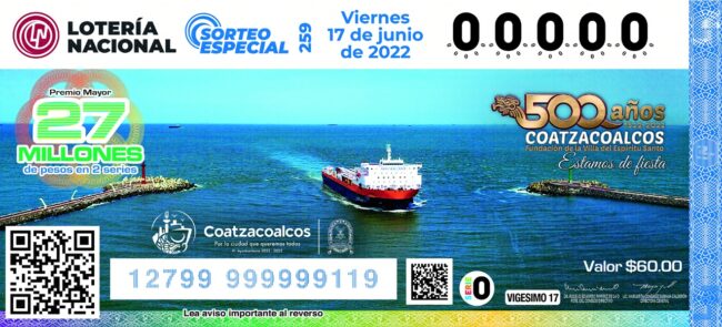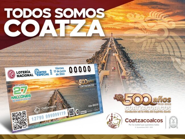 Coatzacoalcos, Ver., 14 de junio de 2022.- El Ayuntamiento de Coatzacoalcos que preside Amado Cruz Malpica y la Lotería Nacional, emitieron un billete conmemorativo de los “500 Años Coatzacoalcos Fundación de la Villa del Espíritu Santo”.