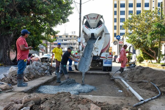 También, como parte de la rehabilitación de drenaje sanitario que se lleva a cabo en la avenida Quevedo de la colonia Puerto México, realizaron el colado el cual forma parte del proceso de la obra para ser entregada en breve a los vecinos de este sector.