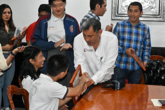 El Alcalde expresó sus felicitaciones a Veikia Nerit del Razo González por lograr el pase a las competencias nacionales para la disciplina de Ciencias Sociales, representando al estado de Veracruz; así como a Monserrat Molina Palma y Alfredo Carlín Tapia por su destacada participación en la especialidad de Electricidad.