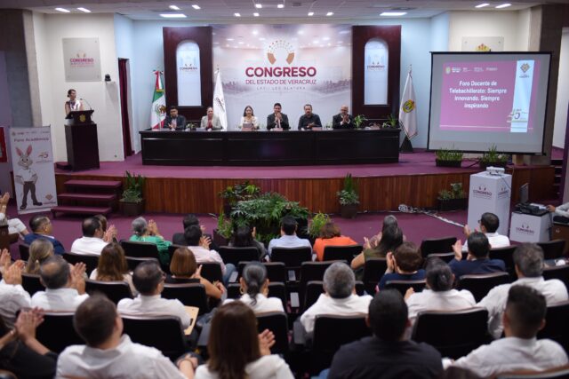 Xalapa, Ver., 19 de septiembre de 2025.- Con un amplio reconocimiento a la labor de docentes, gracias a los cuales, miles de jóvenes en todas las regiones de Veracruz encontraron una puerta abierta hacia el futuro, la diputada Valeria Méndez Moctezuma participó en la celebración del XLV aniversario de la fundación del sistema de telebachillerato en Veracruz (Tebaev), que se llevó a cabo en el auditorio Sebastián Lerdo de Tejada del Palacio Legislativo.