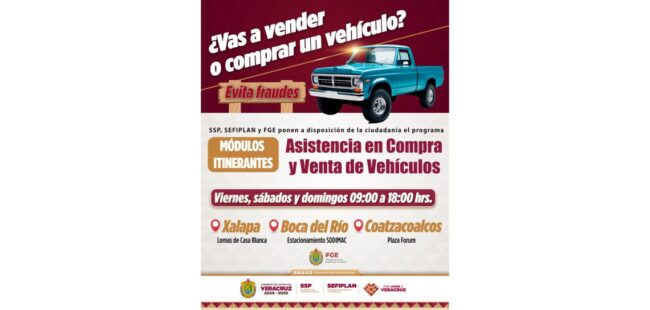 Xalapa, Ver., jueves 09 de abril de 2026.– Con el propósito de fortalecer la seguridad patrimonial de la ciudadanía y prevenir el robo y/o fraude en la compra-venta de vehículos, el Gobierno del Estado, a través de las Secretarías de Seguridad Pública y Finanzas y Planeación, en coordinación con la Fiscalía General del Estado, implementará un programa que consta de módulos itinerantes de asesoría y verificación vehicular.