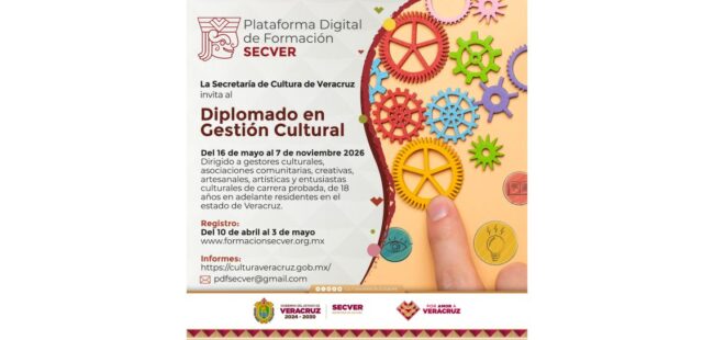 Xalapa, Ver., viernes 10 de abril de 2026.- La Secretaría de Cultura de Veracruz (SECVER) invita a participar en el Diplomado en Gestión Cultural 2026 y el curso Vertientes del Son Jarocho 2026, que se impartirán a través de la Plataforma Digital de Formación SECVER. Ambos programas requieren inscripción previa.