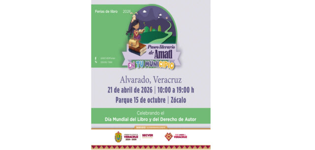 Xalapa, Ver., viernes 17 de abril de 2026.- La Secretaría de Cultura de Veracruz (SECVER), en colaboración con el Ayuntamiento de Alvarado, invita a participar en el Paseo literario de Amatl en tu municipio, el 21 de abril en el Parque 15 de Octubre, con actividades complementarias en la Plaza Cívica y el Casino Alvaradeño.