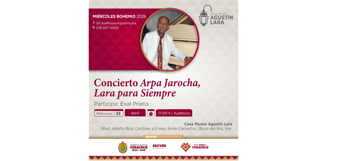Xalapa, Ver., martes 21 de abril de 2026.- La Secretaría de Cultura de Veracruz (SECVER) invita al recital Arpa jarocha, Lara para siempre, el próximo miércoles 22 a las 17:00 horas, en el Auditorio de la Casa Museo Agustín Lara, en Boca del Río. La entrada es gratuita.