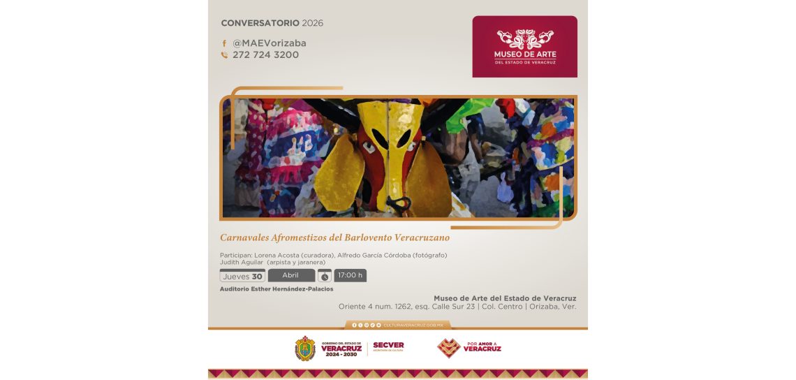 Xalapa, Ver., martes 28 de abril de 2026.- La Secretaría de Cultura de Veracruz invita a conocer la exposición Carnavales afromestizos del Barlovento veracruzano, del 30 de abril al 30 de agosto en la Sala Permanente de Arte Popular del Museo de Arte del Estado de Veracruz (MAEV), en Orizaba, de martes a domingo, en horario de 9:30 a 18:00 horas. La entrada es gratuita.